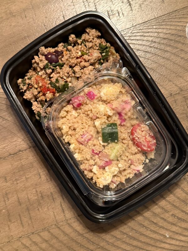 Ground turkey sauteed with spinach, kalamata olives, and sun-dried tomatoes, served with a side of zucchini.