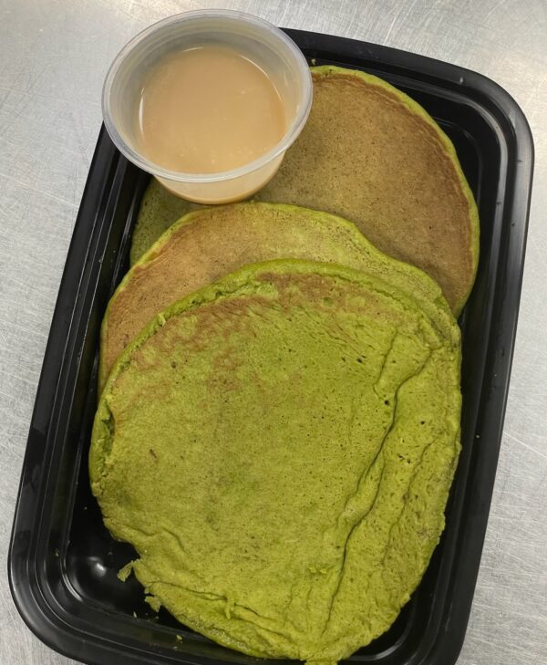 These delicious pancakes have matcha mixed right into the batter and are served with a side of coconut syrup.